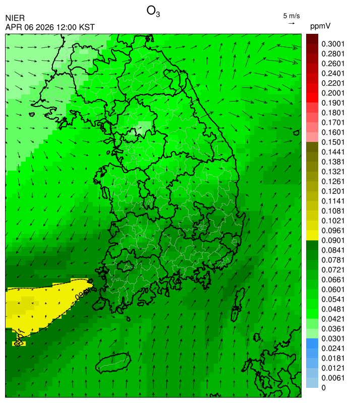 ○ 국외 유입의 영향과 대기오염물질의 광화학 반응에 의한 오존 생성 및 이동으로 대부분 남부 지역은 오후에 일시적으로 농도가 높을 것으로 예상됩니다.