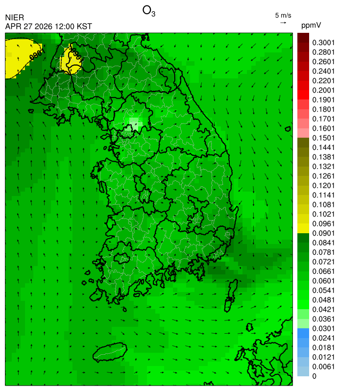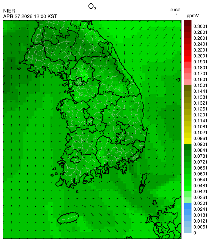 ○ 대기오염물질의 광화학 반응에 의한 오존 생성과 이동으로 대부분 중서부 지역은 오후에 일시적으로 농도가 높을 것으로 예상됩니다.