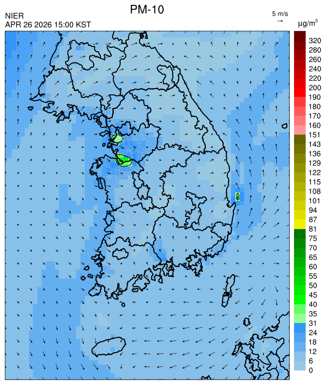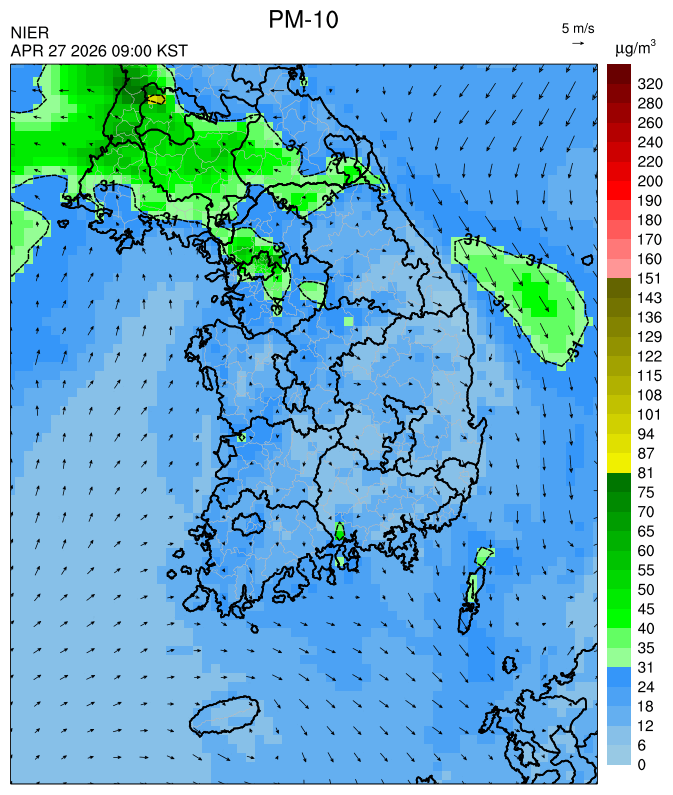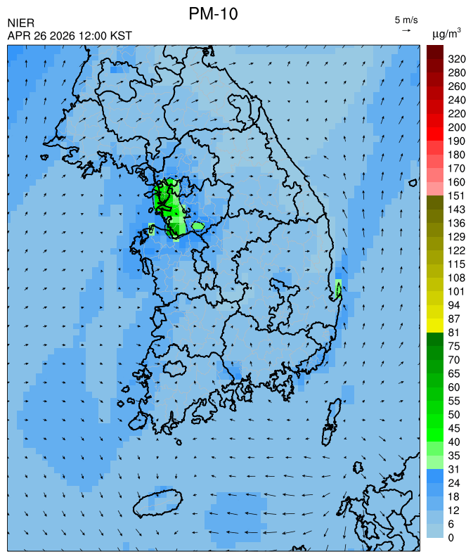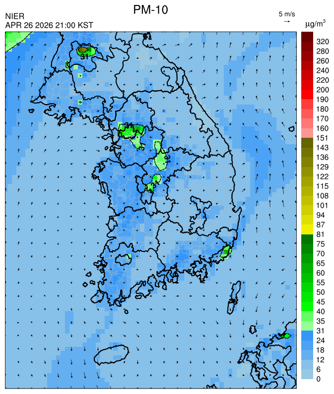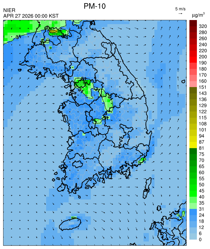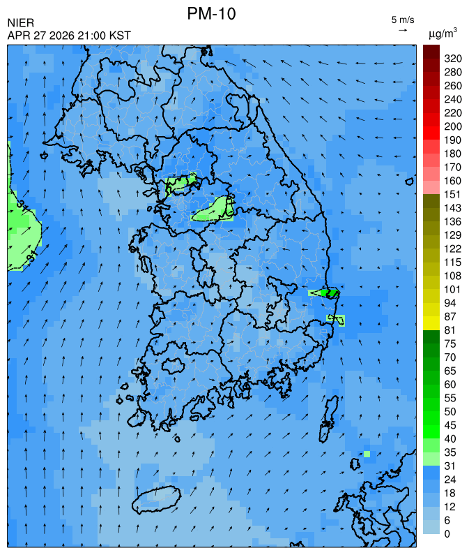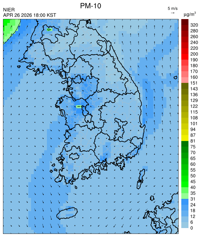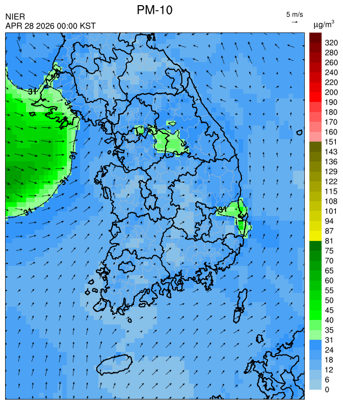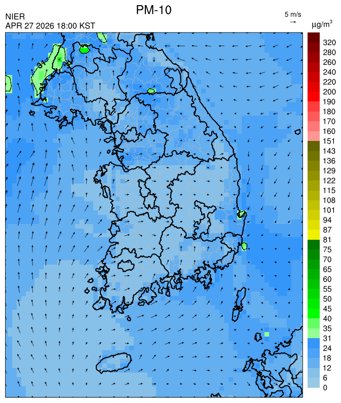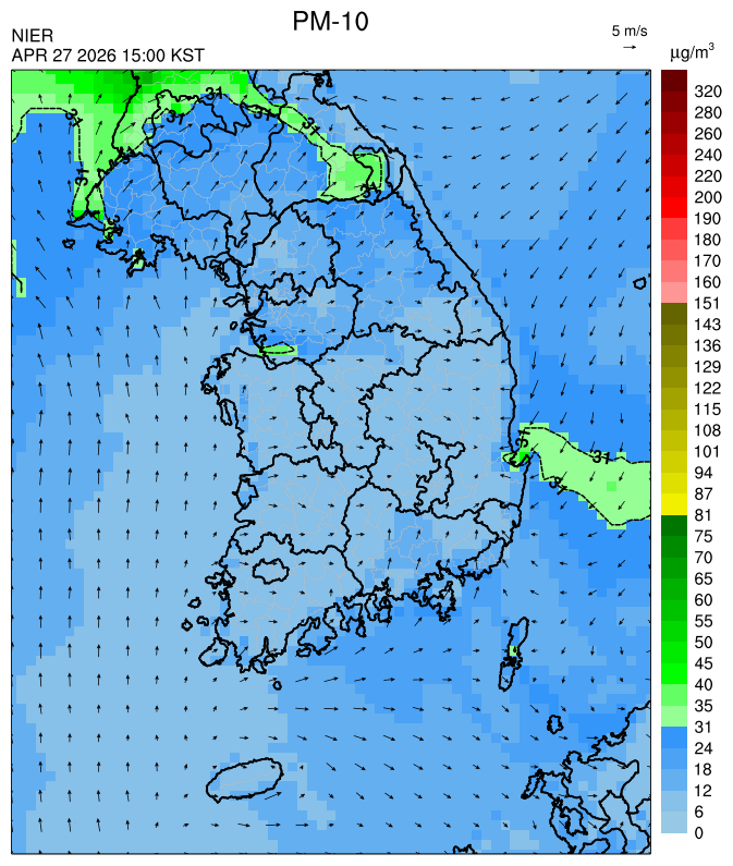 ○ 대부분 중서부 지역과 일부 남부 지역은 오전과 밤에 대기 정체로 국내 발생 미세먼지가 축적되어 농도가 상승하겠으나, 낮동안 원활한 연직(상·하층) 확산으로 대기질이 대체로 '보통'수준일 것으로 예상됩니다.