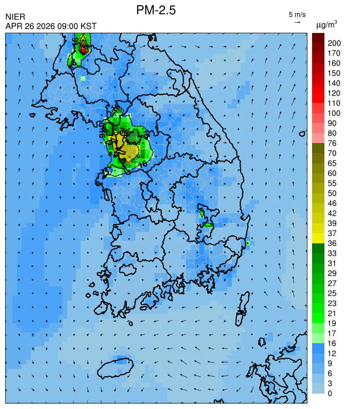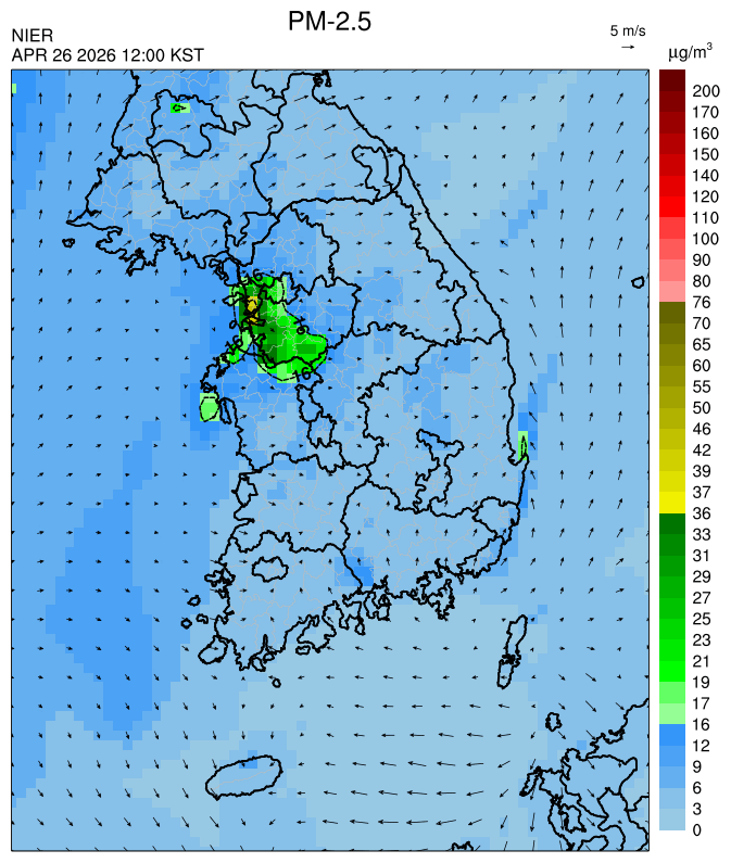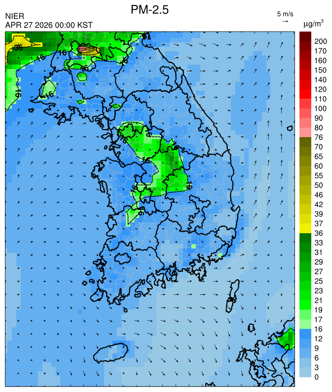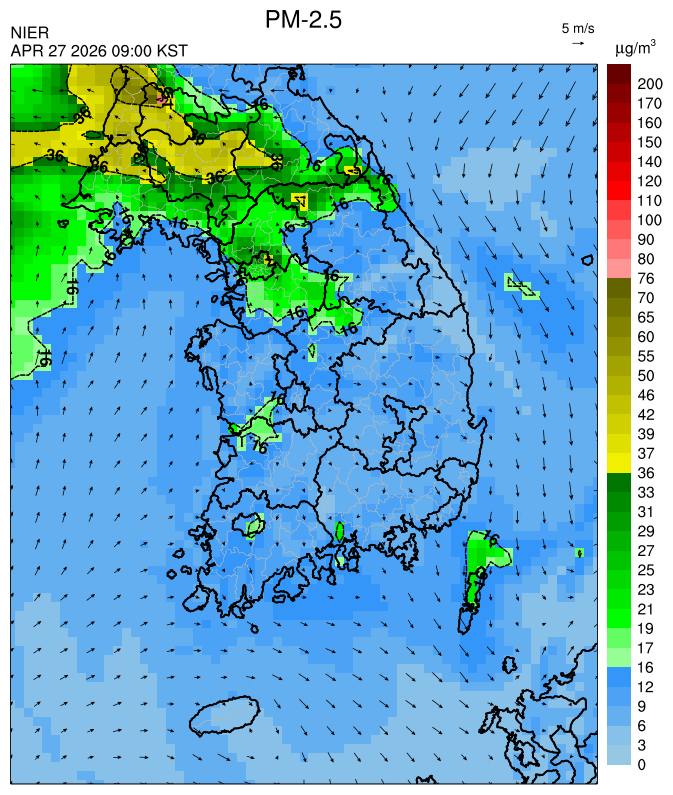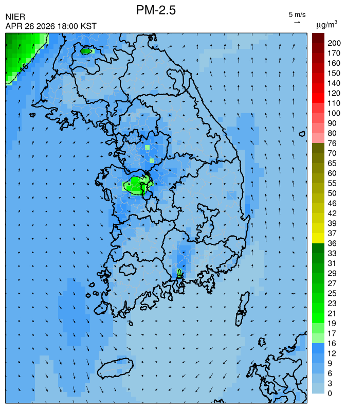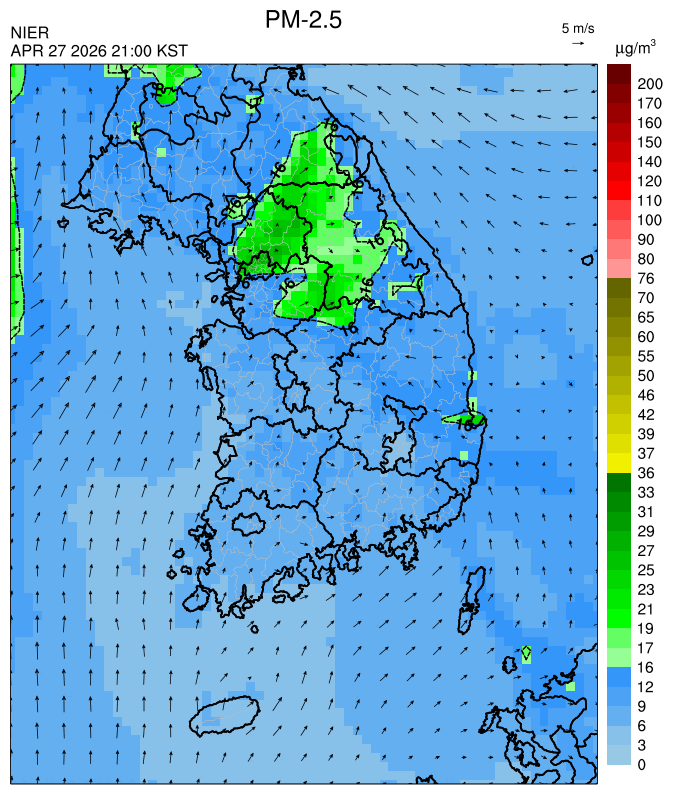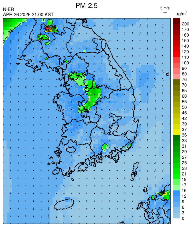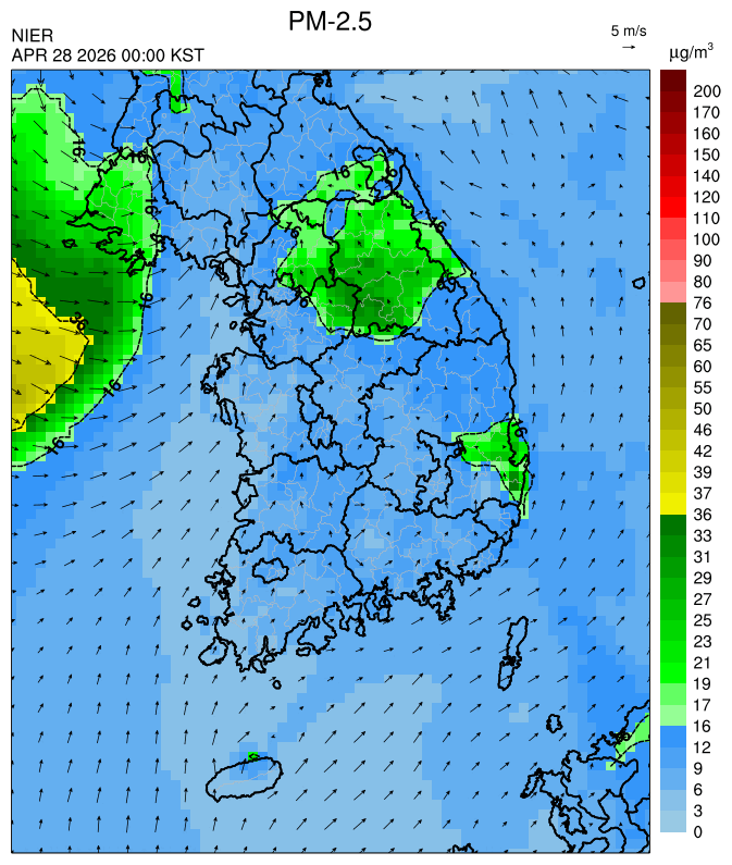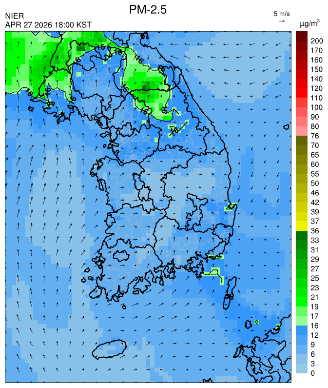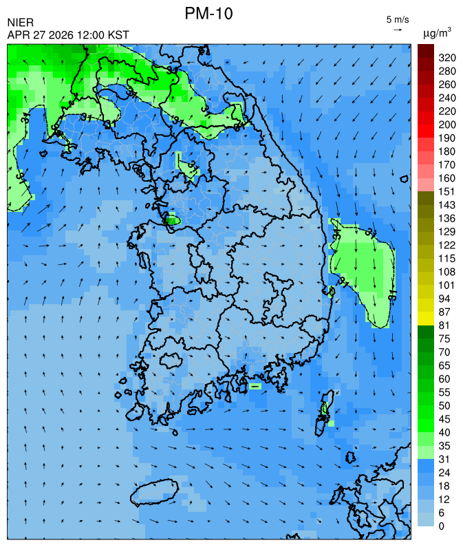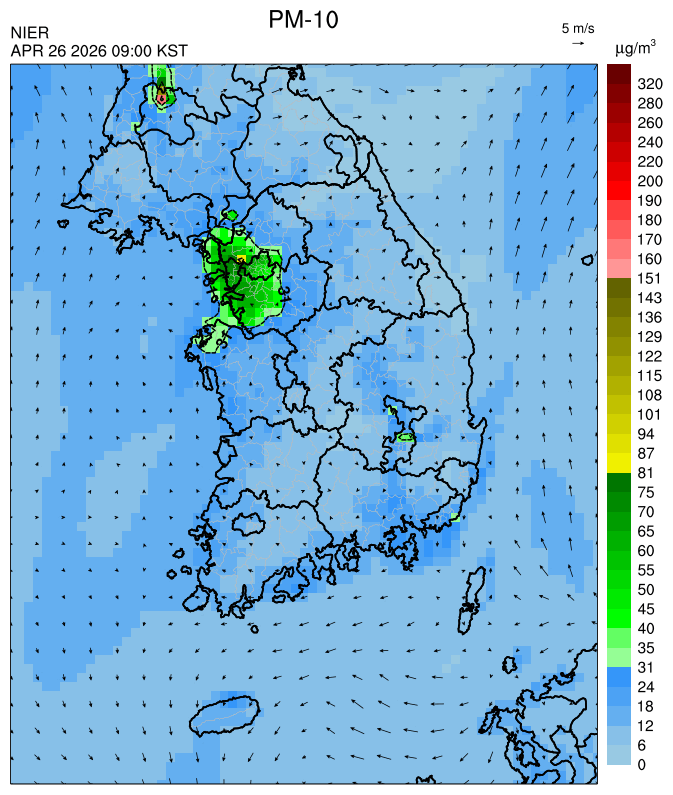 ○ 대부분 중서부 지역과 일부 남부 지역은 오전과 밤에 대기 정체로 국내 발생 미세먼지가 축적되어 농도가 상승하겠으나, 낮동안 원활한 연직(상·하층) 확산으로 대기질이 대체로 '보통'수준일 것으로 예상됩니다.