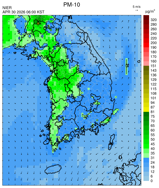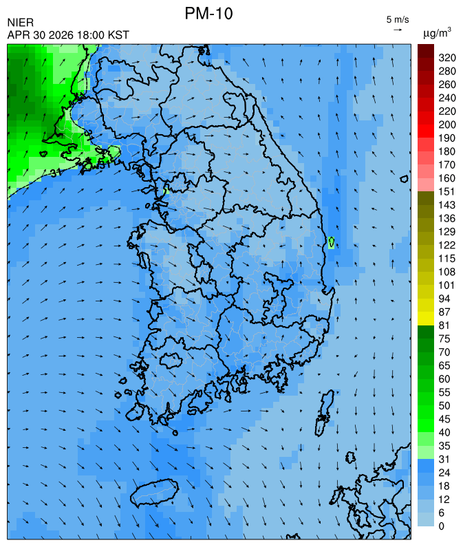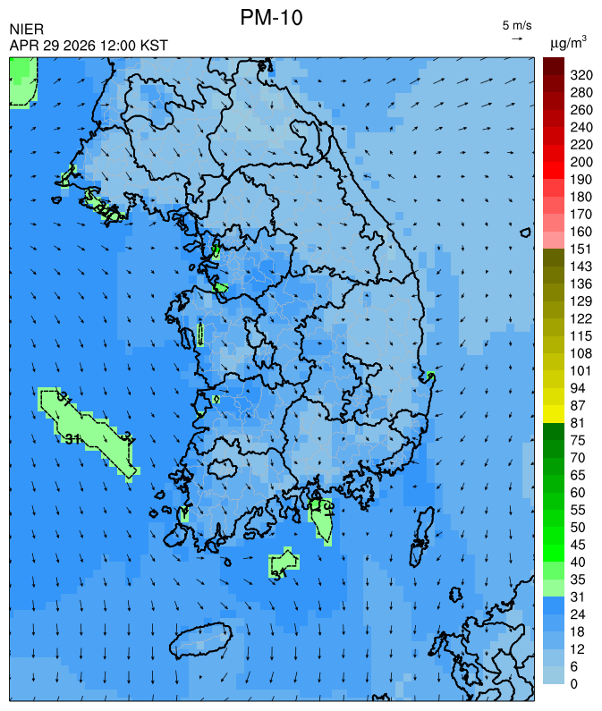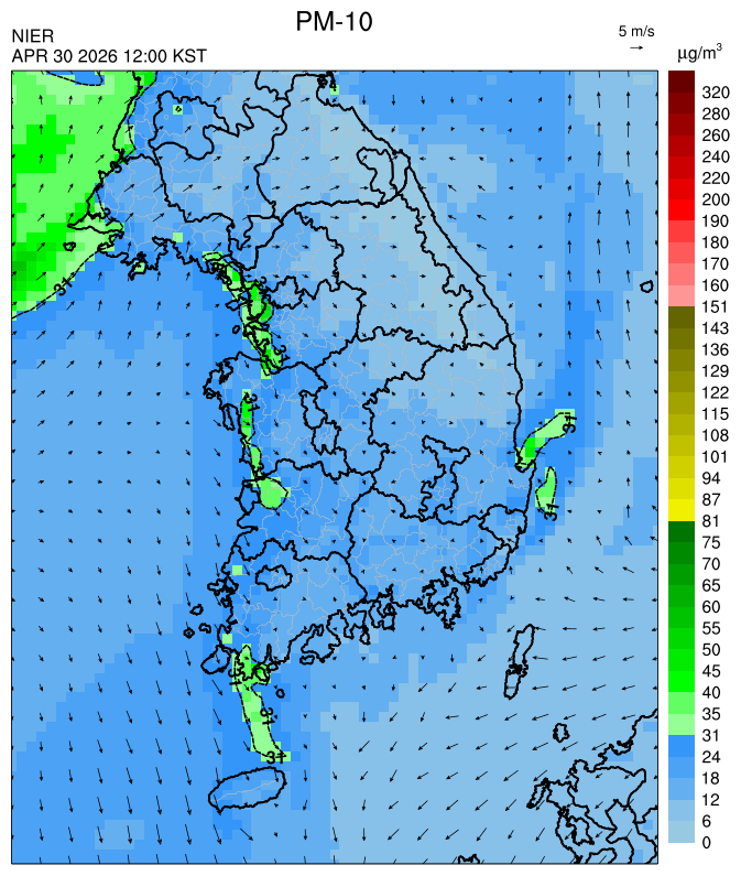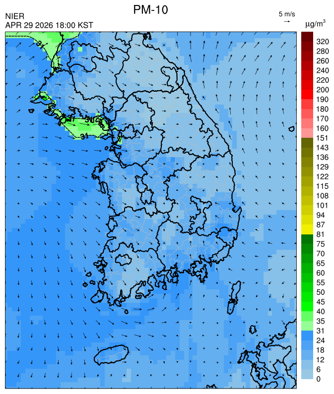 ○ 대부분 지역은 오전까지 대기 정체로 미세먼지가 축적되어 농도가 상승한 가운데, 오후부터 북서풍을 타고 '보통' 수준의 국외 미세먼지가 유입되어 대부분 서쪽 지역에서 일평균 농도는 '보통'으로 예상됩니다.